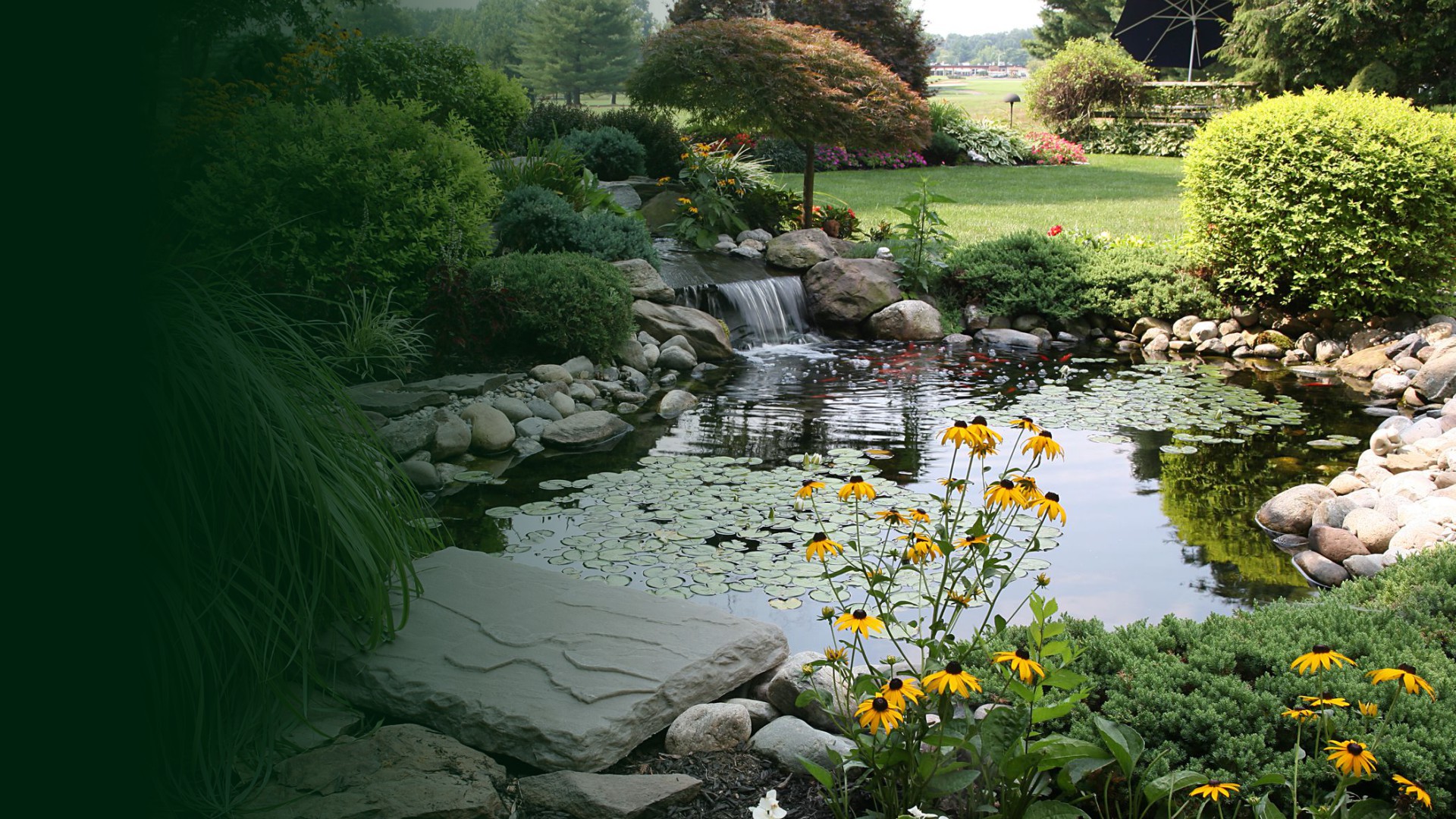 Desain dan instalasi air terjun serta aliran sungai buatan yang menghadirkan suara gemericik air menenangkan dan visual yang memukau.